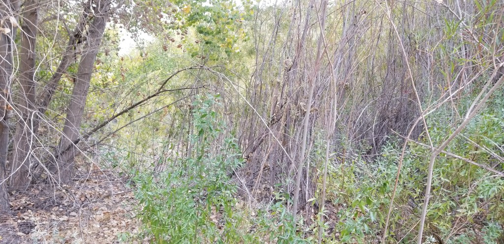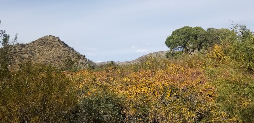 At the first mile, I reached the stone house, an abandoned cabin that has been rehabilitated by the Wildlands Conservancy. Immediately following the stone house is a junction between Mission Creek Road and a spur route to the Pacific Crest Trail. After this junction, the distance to the PCT is about two miles. The first point of interest I visited on the spur trail was a desert wetland area, replete with live oaks, desert willows, and wild grapevines.