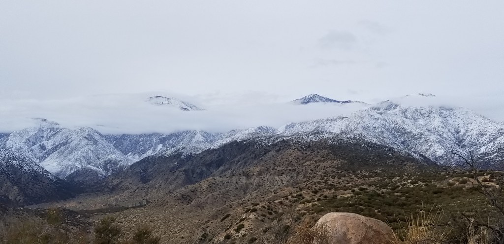 As the trail continues up through a tributary wash to Mission Creek, the canyon walls open up to a grand view of the San Gorgonio high country. The snowline here seemed tantalizingly close, but it was still several trail miles away, and several more hundred feet in elevation above. At the junction of the PCT, the Whitewater Preserve is six and a half miles on the southbound route to the left. I took the fork to the right, the northbound PCT, which snakes it’s way up to the top of gently sloping bench. Here the views were expansive and panoramic, with seemingly every mountain in sight attired in a silvery, snowy gown.